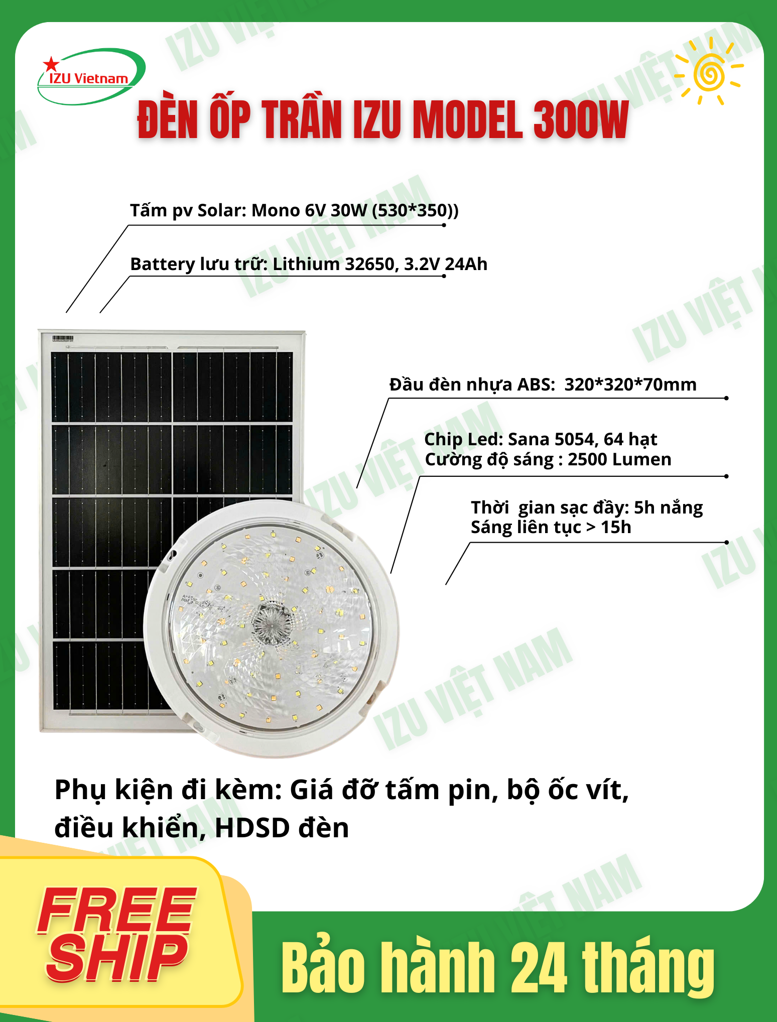 Dưới đây là các thông số kỹ thuật của đèn ốp trần năng lượng mặt trời 300w mà Izu Vietnam cung cấp để bạn dễ dàng tham khảo: